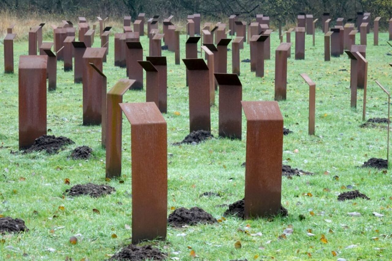 Schwesing – 300 Stelen, für jeden Toten eine. Sie stehen wie mit hängenden Köpfen, vereinzelt, verzweifelt im Nirgendwo zwischen Schwesing