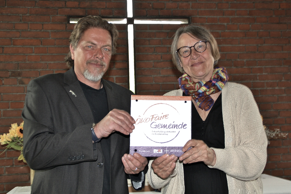 Die Veranstaltung wurde auf dem Kirchenvorplatz eingeleitet von Musik, die der Posaunenchor Husum mit Gästen aus Mildstedt und Hattstedt spielte. Sinnbildlich zum Motto „sich kümmern und teilen“ hatte Kirchengemeinderatsmitglied Inge Matthiesen ein Brot gebacken, das seinen Platz auf dem Altar einnahm. Einen symbolischen Schlüssel übergab Pastor Raabe an den neuen Hausherrn, Volker Schümann. Karsten Wolff vom Kirchenkreis Nordfriesland übergab das Siegel „Ökofaire Gemeinde“: Damit kann die Kirchengemeinde Husum zukünftig punkten, denn sie gestaltet ihre Beschaffungsprozesse fair und ökologisch nachhaltig. Lilo Lenhard hatte sich besonders um dieses Thema gekümmert und nahm das Siegel entgegen.
