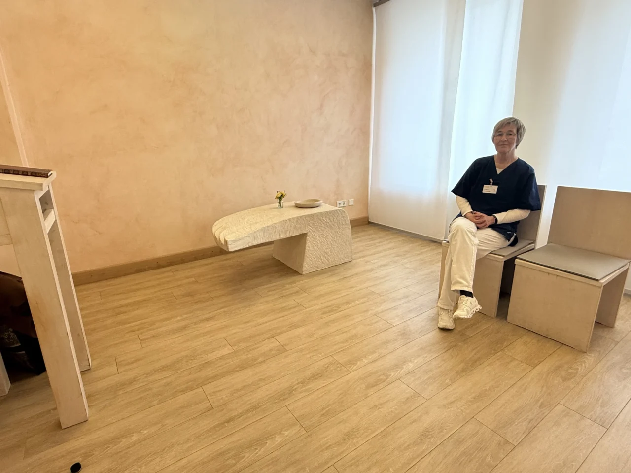 Im Krankenhaus Husum ist das der Raum der Stille. Und mittendrin: Pastorin Kathrin Hansen, die im Auftrag des Kirchenkreises Nordfriesland für Patientinnen und Patienten, Angehörige und Mitarbeitende da ist.